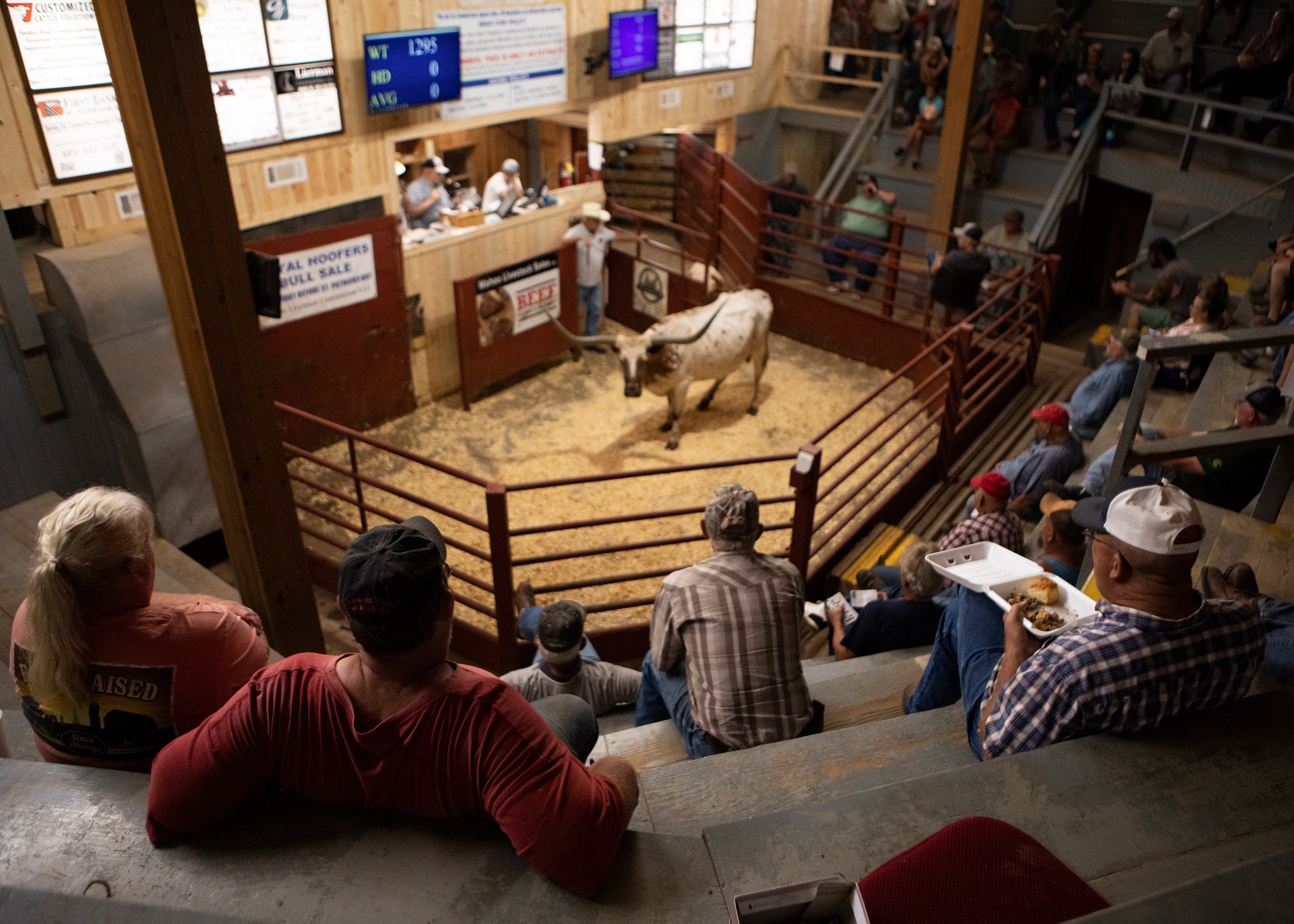 Crowds gather during the longhorn sale at the Wahoo Livestock Sales sale barn on Friday, Aug. 7, 2020, in Wahoo, Nebraska. After the passing of a local longhorn rancher, Wahoo Livestock Sale hosted a rare longhorn auction.