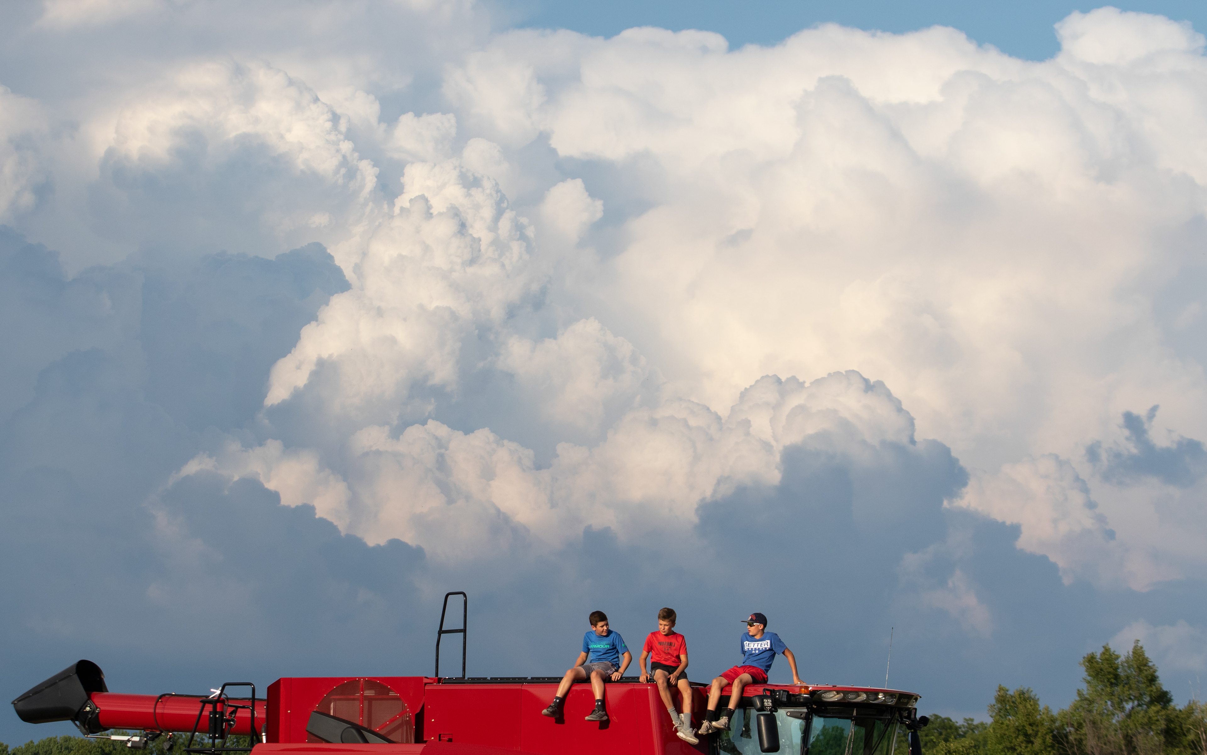 Jack Vanslyke of Wahoo, left, Alex Barry of Wahoo and Wyatt Jelinek of Valparaiso hang out on top of a combine during the Saunders County Tractor Pull on Saturday, Aug. 1, 2020, in Wahoo, Nebraska.