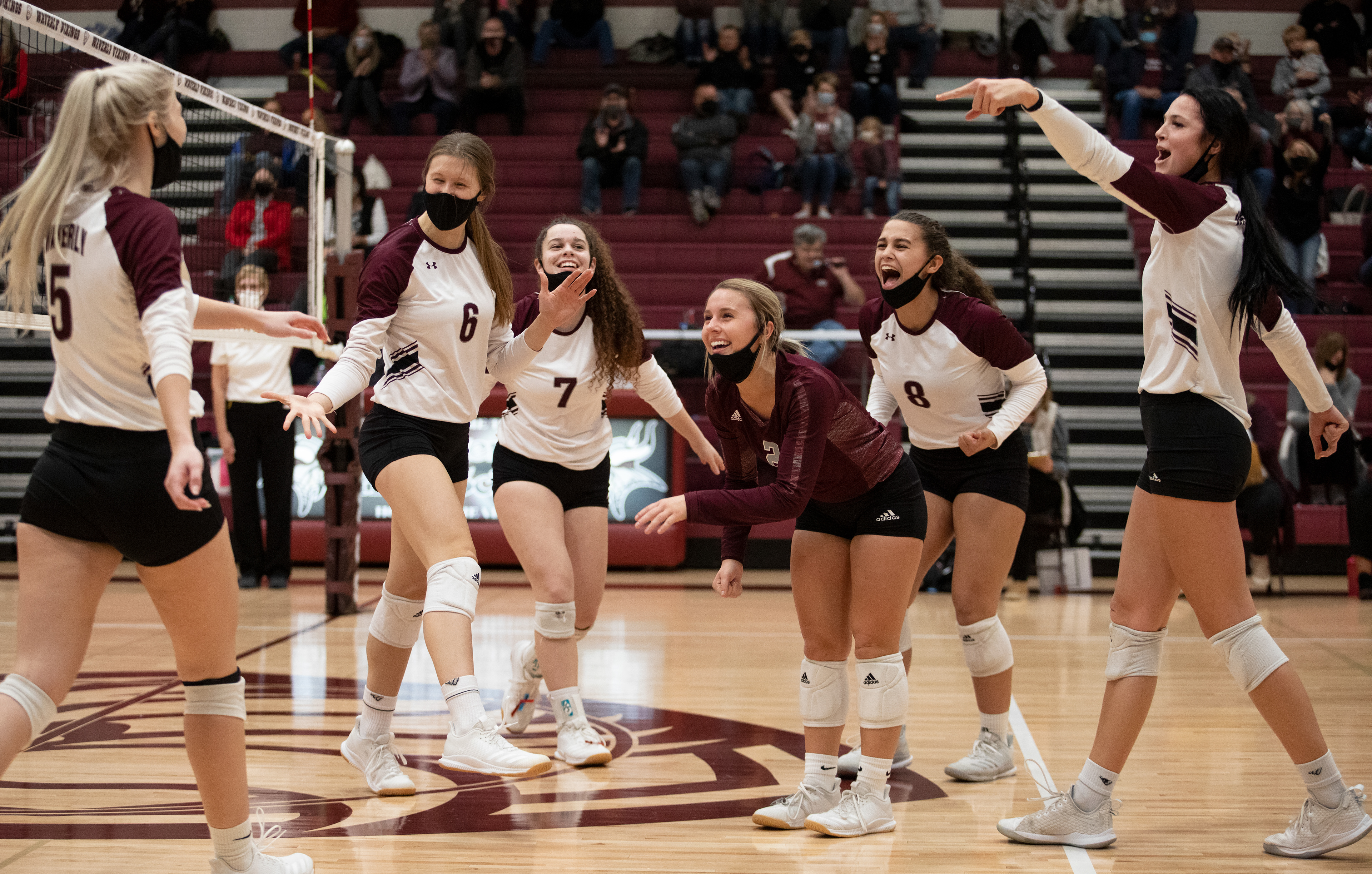 Waverly High School varsity volleyball celebrates a point made by Bailey Jeffers (5) during a game against Elkhorn at Waverly High School on Thursday, Oct. 22, 2020, in Waverly, Nebraska.