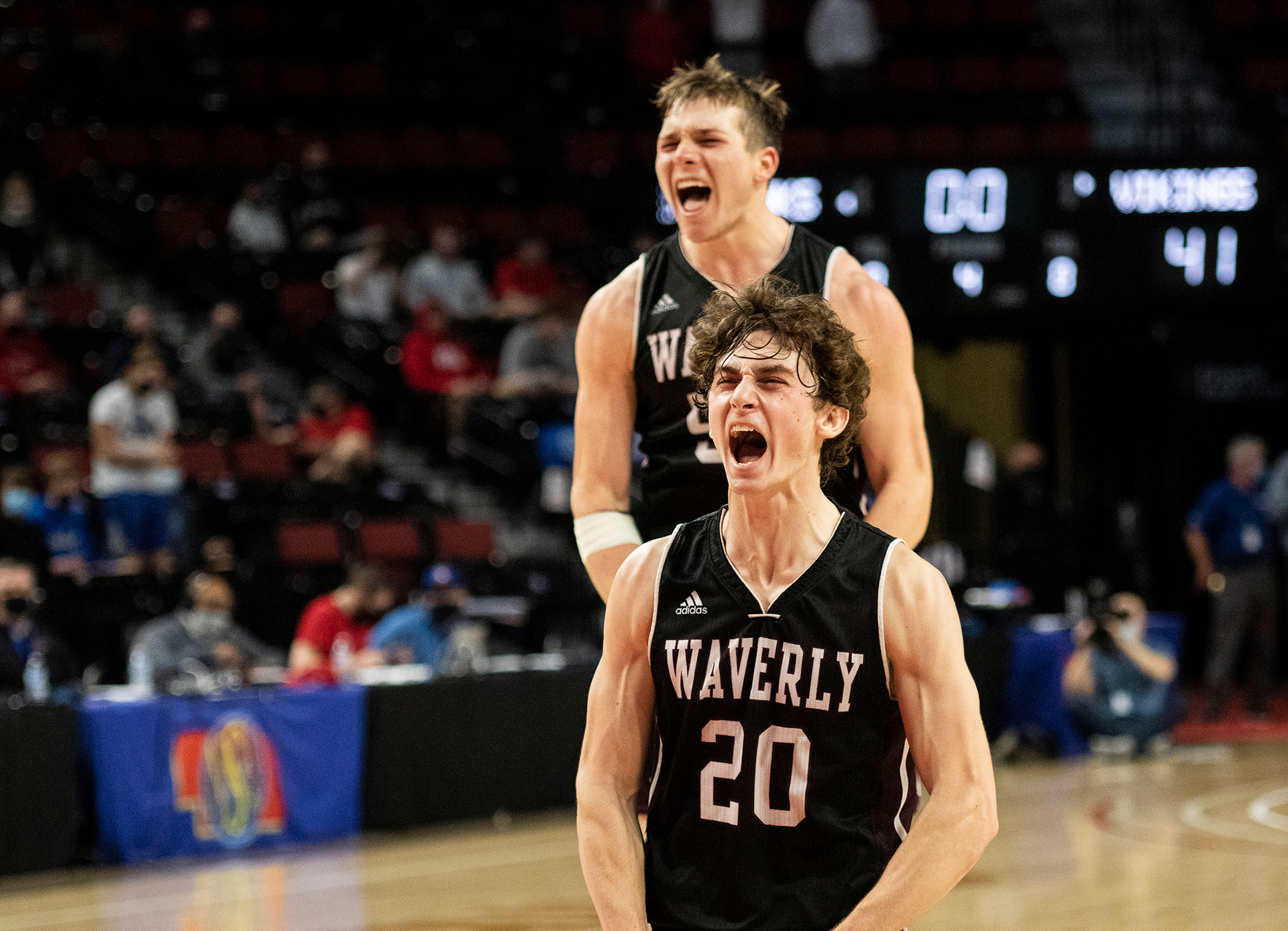 Waverly High School senior Andrew Heffelfinger (20) and Waverly junior Hogan Wingrove celebrate a win over Omaha Skutt during the Class B Boys Basketball Nebraska State Championships at Pinnacle Bank Arena on Wednesday, March 9, in Lincoln, Nebraska. Heffelfinger’s basket in the final seconds of the game put Waverly 41-40 over Omaha Skutt sending the team to a semifinals game and achieving the first state win for the Vikings since 1995.