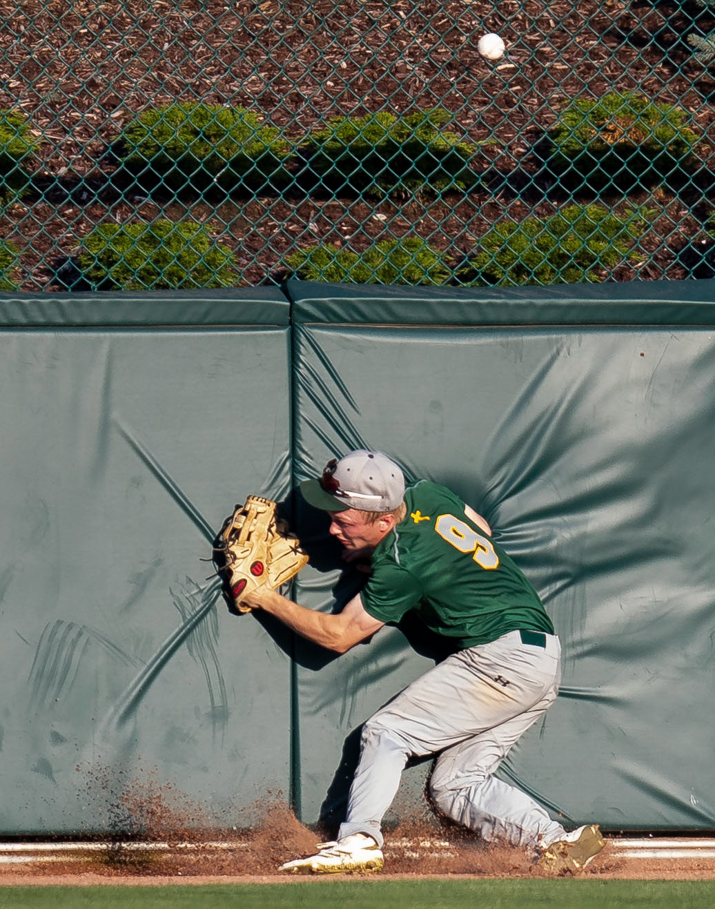 Archbishop Bergan's Luke Jessen hits the center field wall trying to catch a hit from Millard West's Max Anderson resulting in an in-field home run for Millard West during their state tournament game on Tuesday, May 14, 2019, at Haymarket Park in Lincoln, Nebraska.