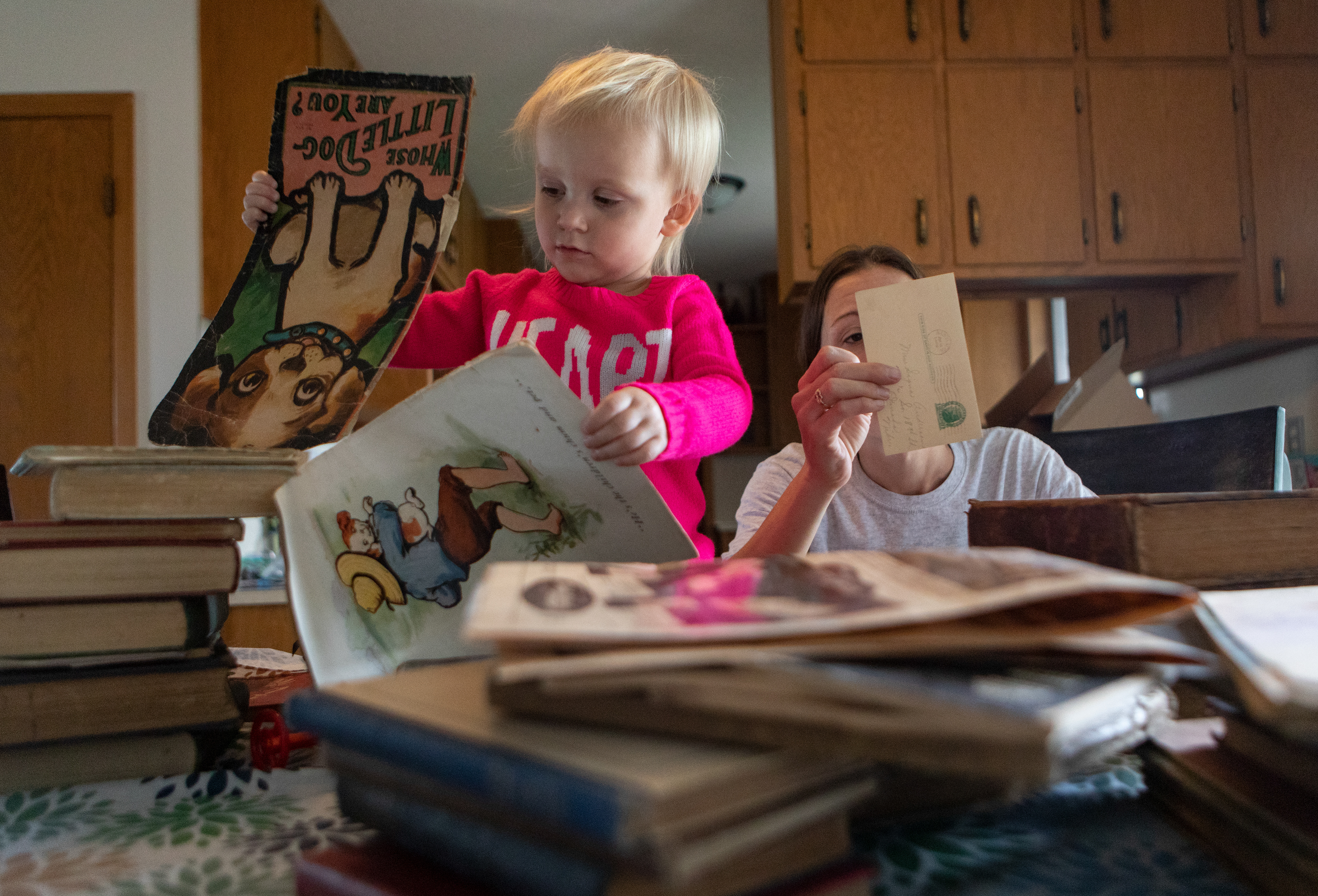 Amanda Benkusky, right, and her daughter Adeline go through the belongings of Elsie and Helen Anderson at the Benkusky home on Monday, Sept. 28, 2020, in Wahoo, Nebraska. Benkusky recently reached out on a community Facebook page asking for any relatives of the sisters. Benkusky found the box when she was moving out of the Anderson sisters former home after briefly living there in 2008. The boxes were full of bibles, children books and a lifetime of memories. Helen lived to be 92 and died in 1998 and Elsie lived to be 99 and died in 2007. Neither sister have any known remaining relative.