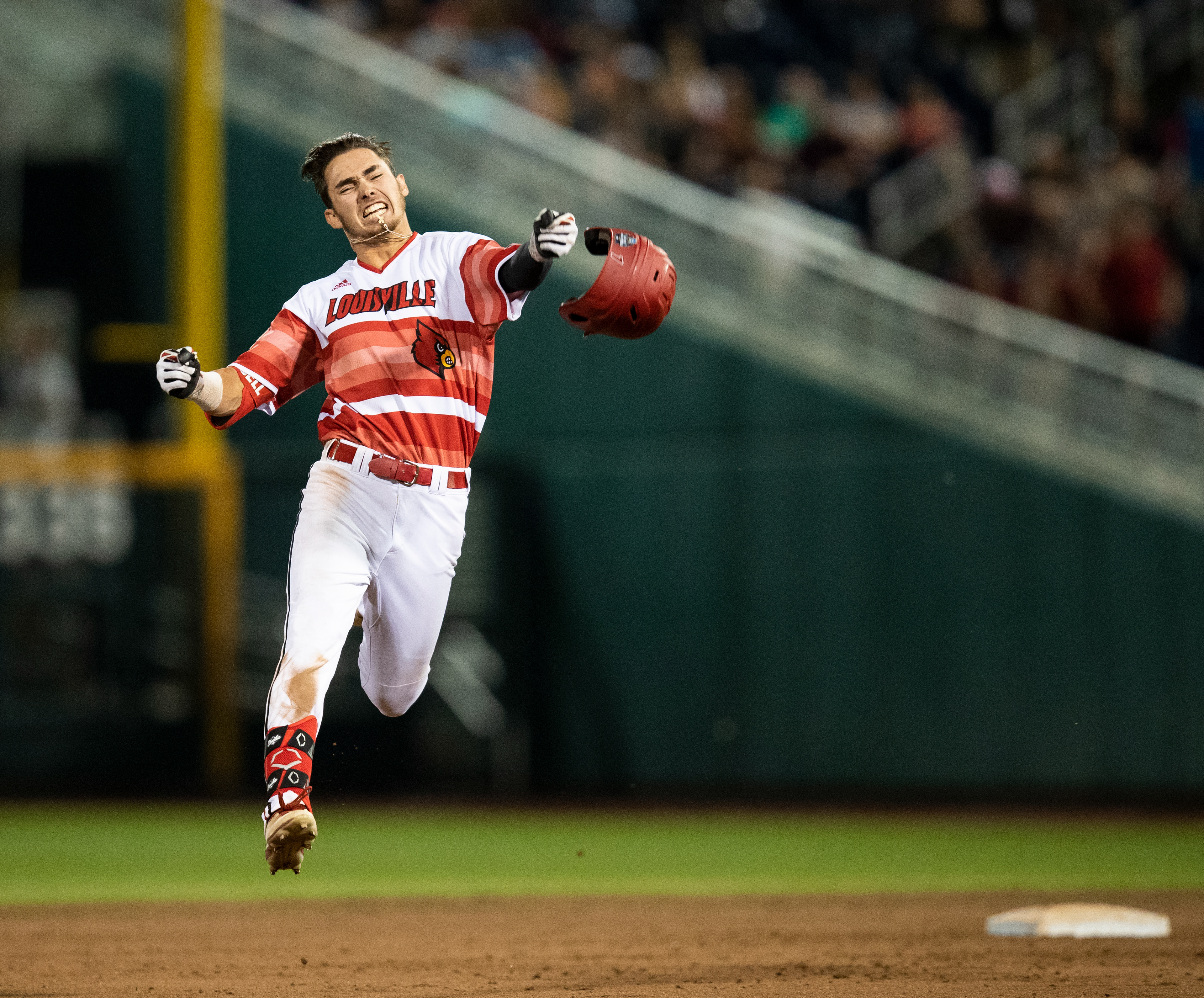 Louisville's Drew Campbell celebrates a walk-off win on his hit in the bottom of the ninth against Mississippi State during game ten of the College World Series at TD Ameritrade Park on Thursday, June 20, 2019, in Omaha Nebraska.