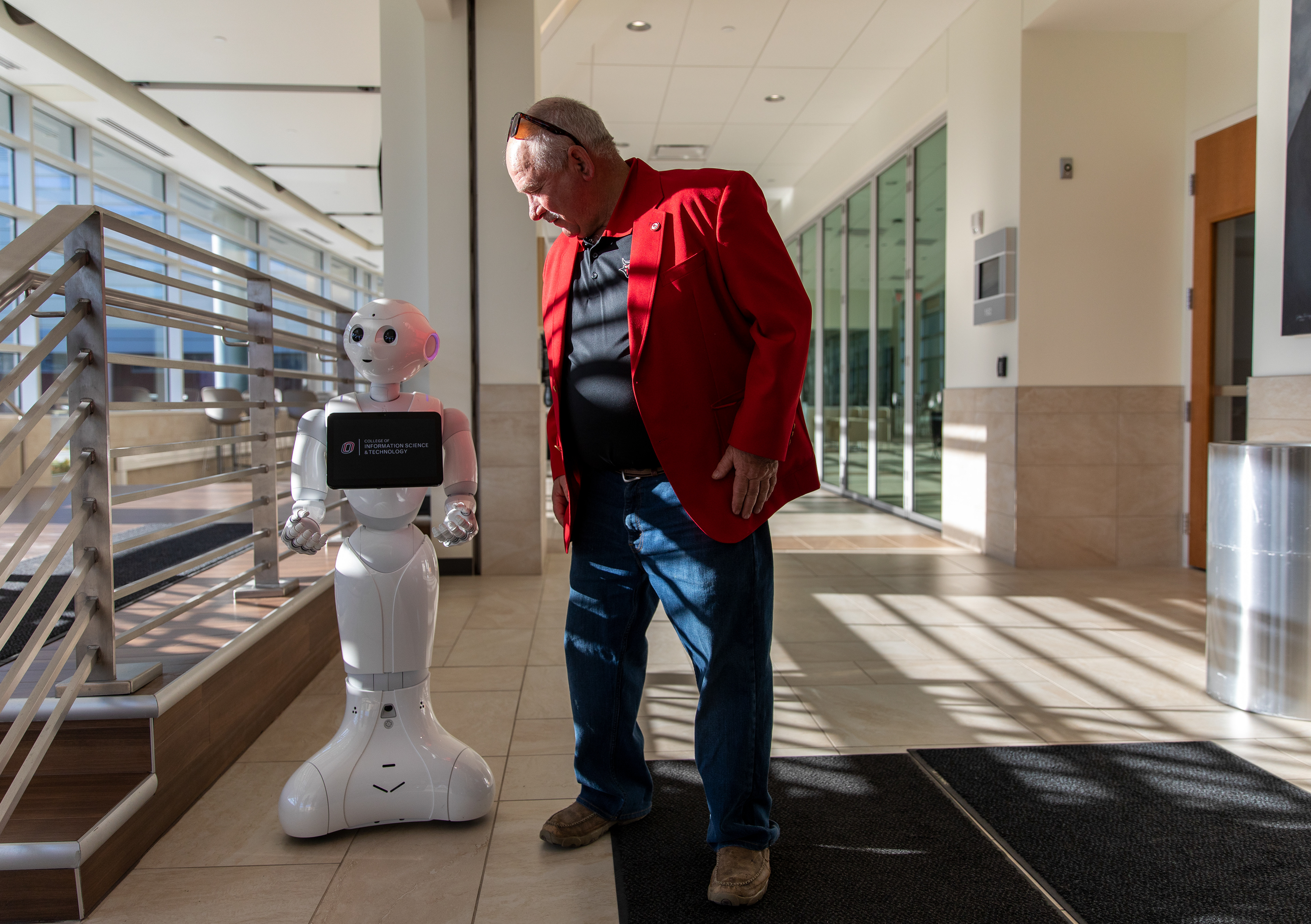 NU System Regent Paul Kenney of District 6 is greeted by Pepper the Robot during a tour of UNO’s campus on Thursday, April 6, 2023, in Omaha, Nebraska.