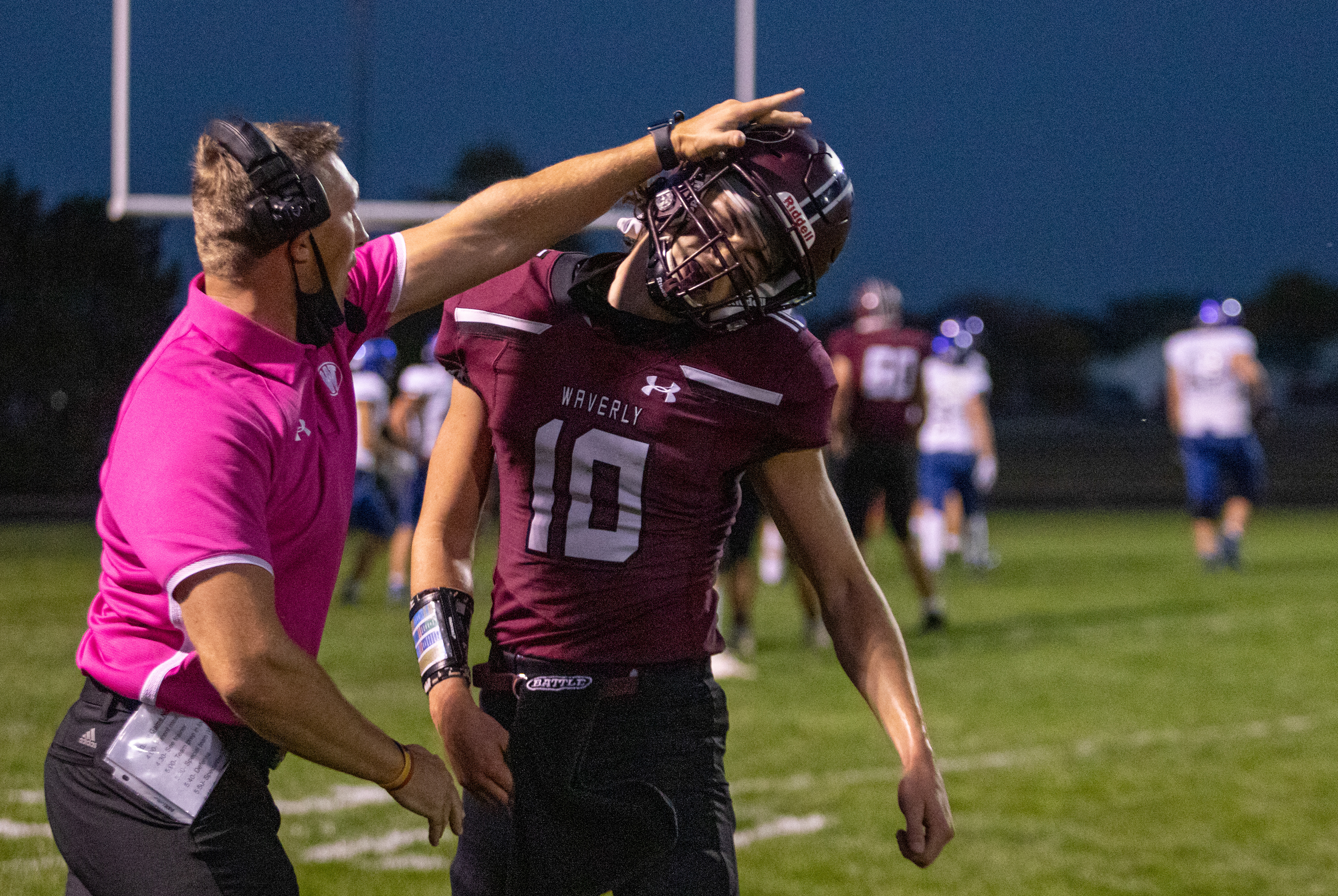 Waverly’s quarterback Cole Murray (10) is greeted by head coach Reed Manstedt after scoring the first touchdown of the game against Plattsmouth on Friday, Oct. 9, 2020, in Waverly, Nebraska.