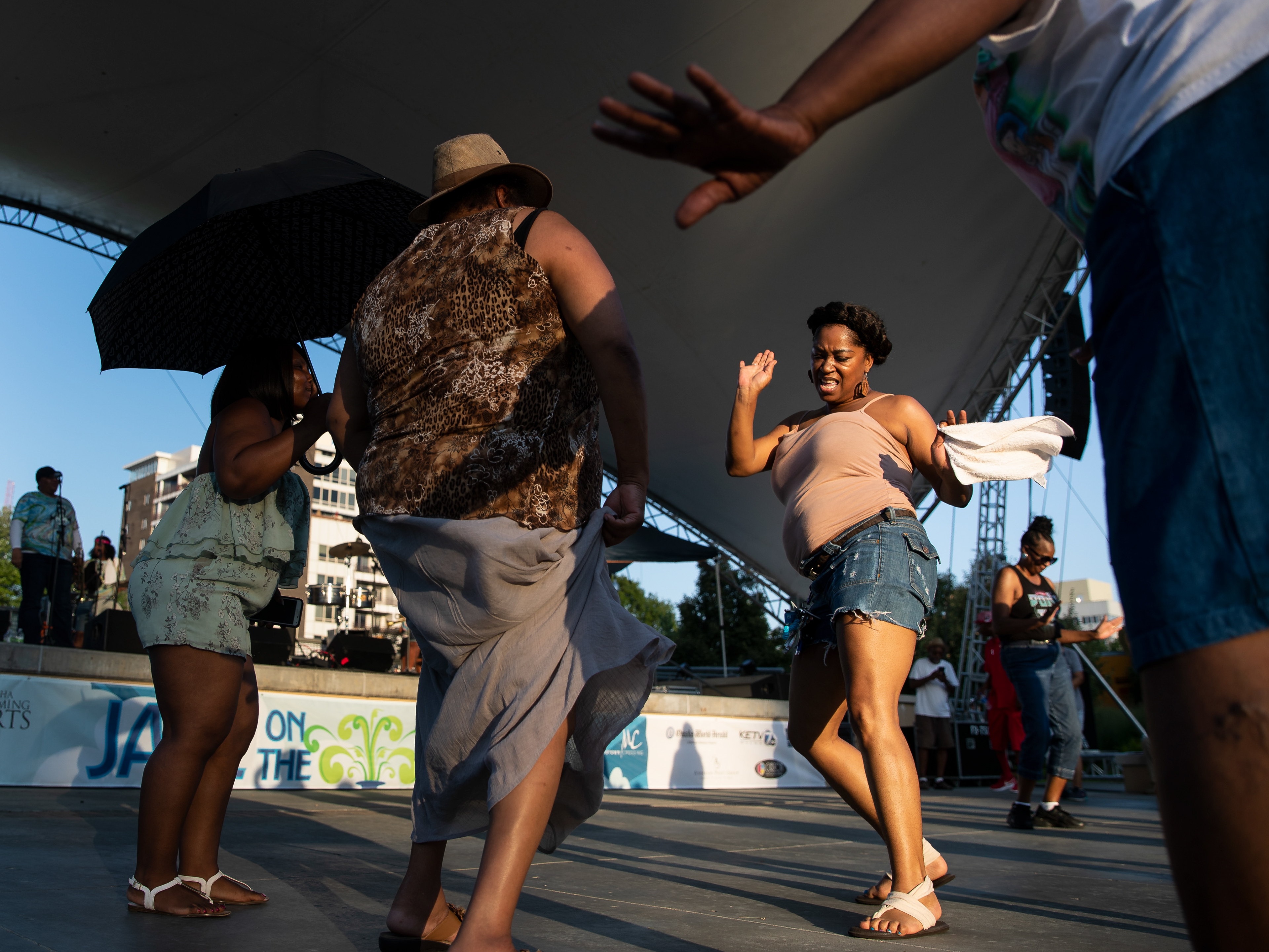 Omaha's Shar-Mar Garnier, left, dances with a group during  the Pinettes Brass Band's performance at Jazz on the Green at Midtown Crossing on Thursday, July 18, 2019, in Omaha, Nebraska.