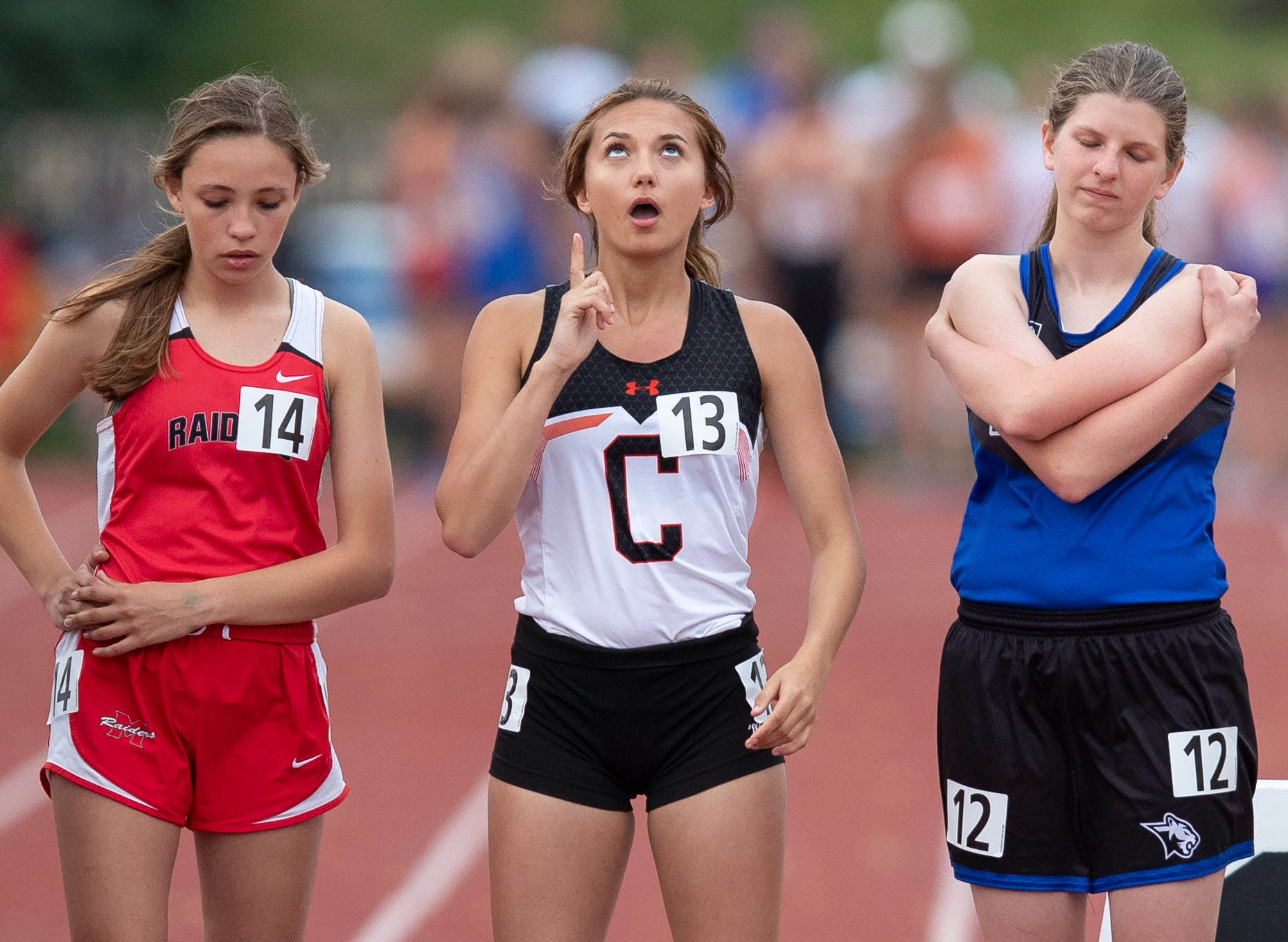 Crawford's Jillian Brennan (13) points up to the sky before the Class D 3,200-meter final at Omaha Burke High School during day one of the state meet on Friday, May 15, 2019, in Omaha, Nebraska.