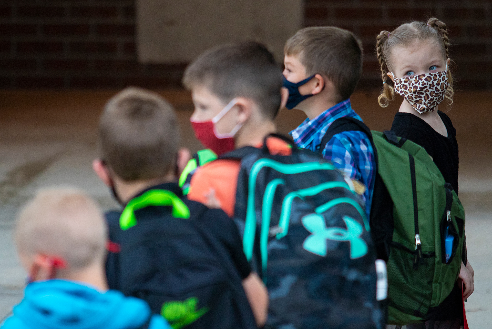 First-grader Lilly Starkweather sports a cheetah print mask for the first day of school at Raymond Central Elementary School in Ceresco, Nebraska, on Wednesday, Aug. 12, 2020. As schools throughout Nebraska reopen for the first time since March, things look a little different.